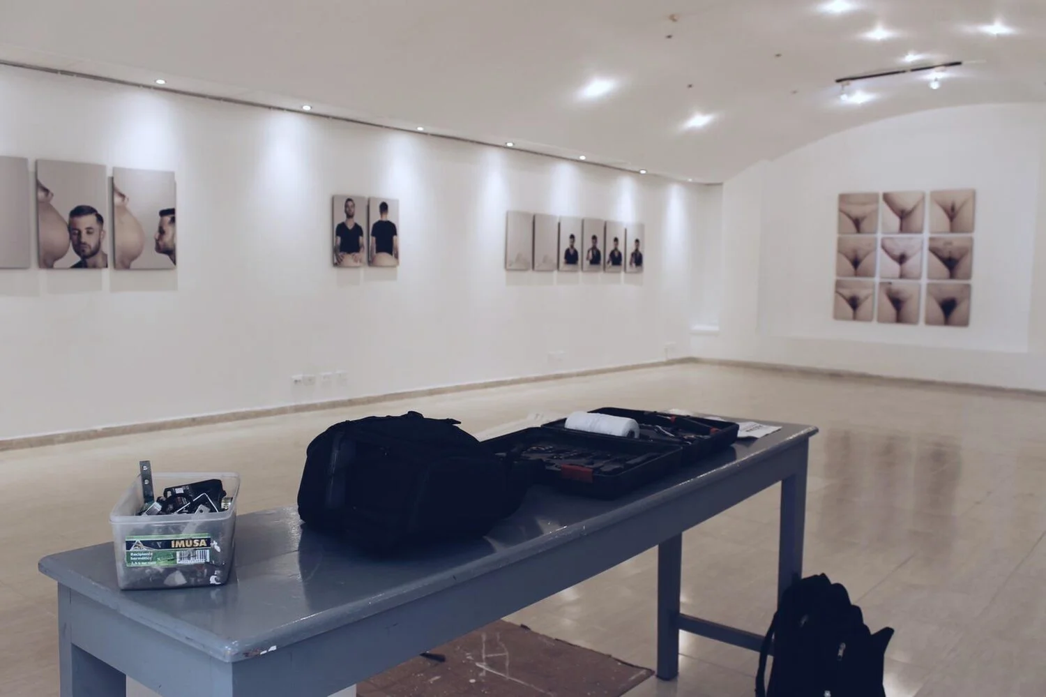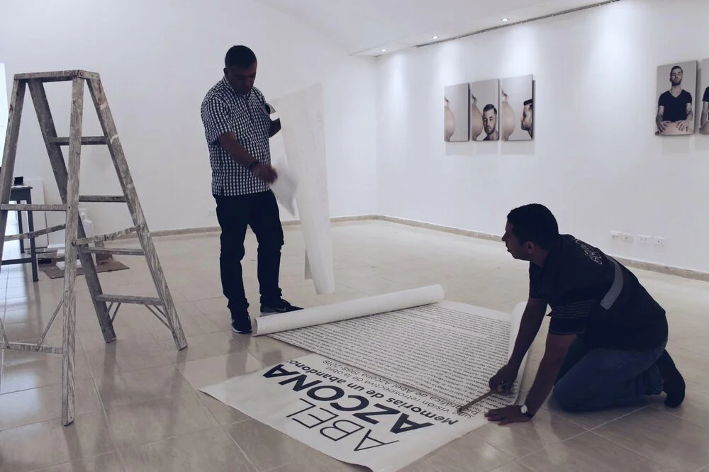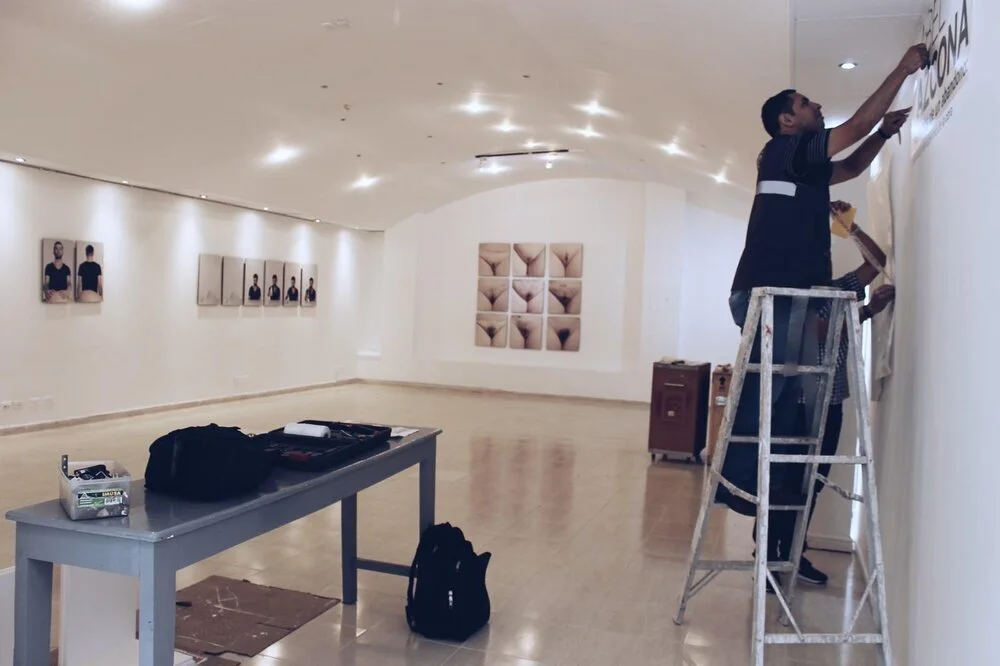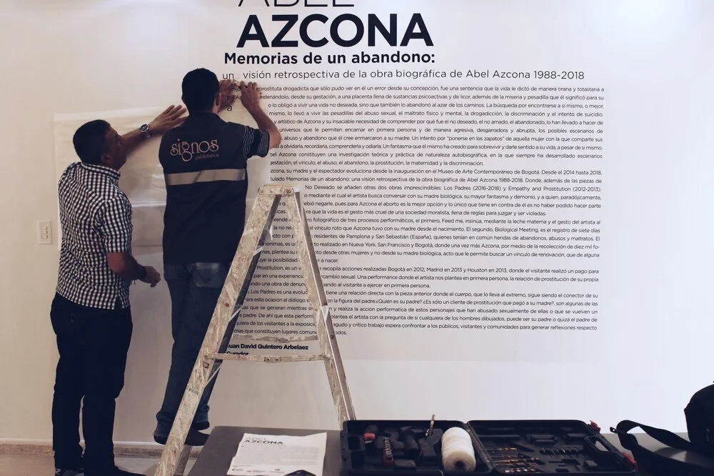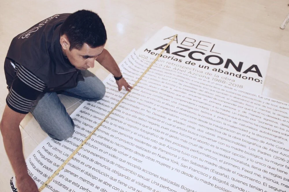 Assembly process of the second retrospective exhibition dedicated to Abel Azcona in Colombia around pieces related to motherhood.