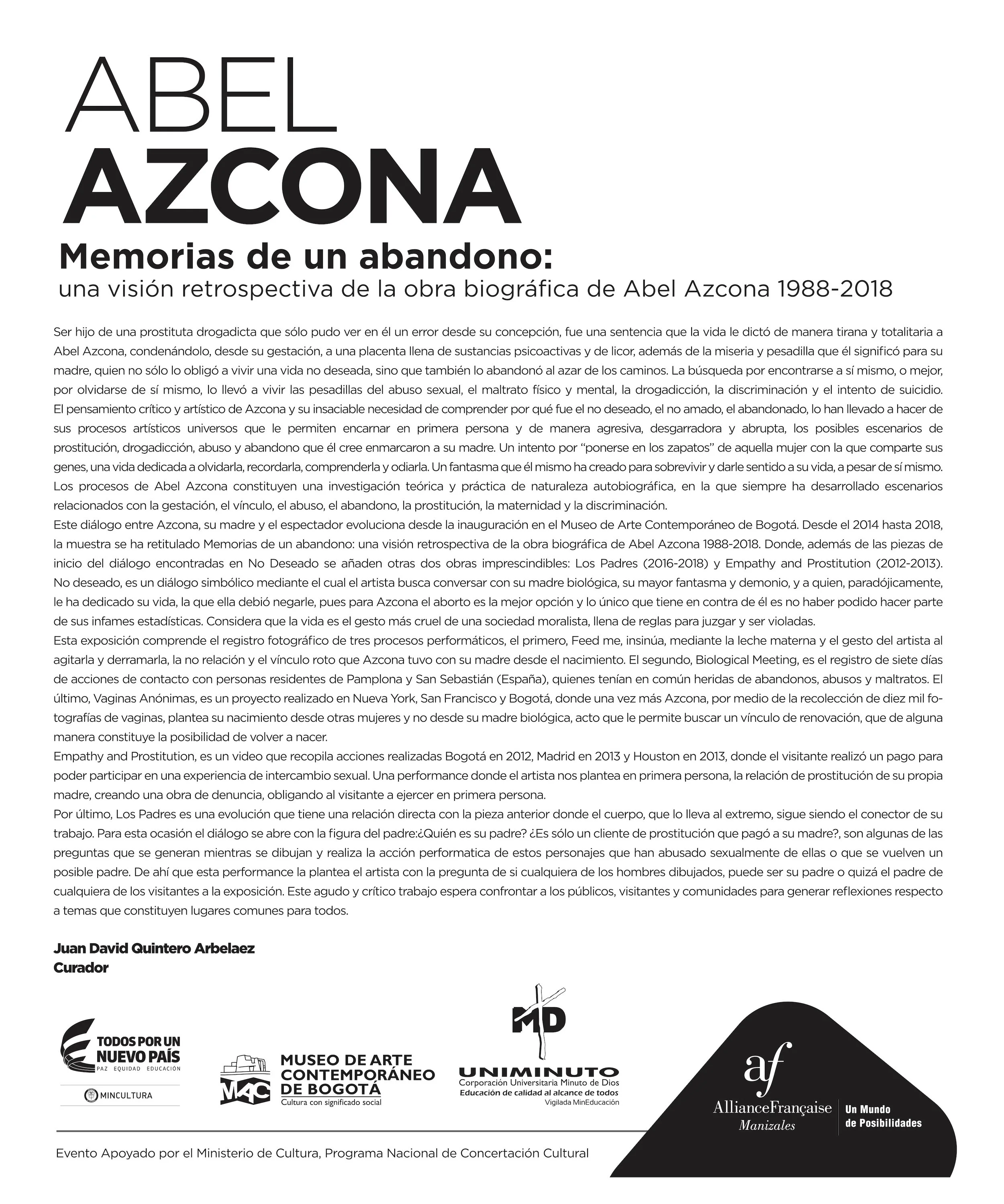 Memorias de un abandono (1988-2018) es una visión y muestra retrospectiva dedicada al artista Abel Azcona en la ciudad colombiana de Manizales. El Museo de la Alianza Francesa del lugar inauguró, el 10 de agosto de 2018, una exposición con obras de fotografía, videoarte, performance art e instalación. La muestra, al igual que la bautizada como “No deseado” en el Museo de Arte Contemporáneo de Bogotá los años 2014 y 2015, fue comisariada por Juan David Quintero, con la amplia selección de obras de Azcona en torno a la maternidad, esta vez incluyendo dos nuevas piezas completas en las que el artista dialoga sobre su relación paternofilial. Una de ellas, bajo el nombre “Los Padres”, donde el artista plantea por vez primera la figura paterna, también implícita en la segunda pieza incluida bajo el nombre de “Empatía y prostitución”. Una documentación videográfica de la performance en vivo realizada en la ciudad de Houston, donde Azcona empatiza y desarrolla desde un espíritu critico un ejercicio de empatía con su noche de gestación, marcada por un intercambio económico entre su figura paterna y su figura materna.